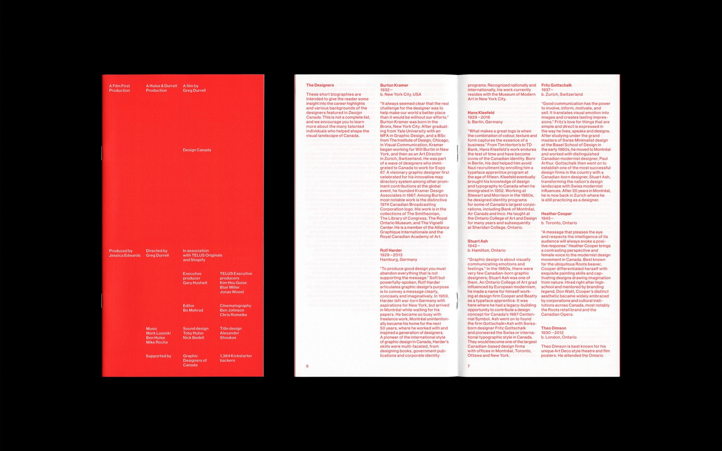 Design Canada is a feature length documentary film that highlights the contributions of a group of 1960s graphic designers, who shaped the identity of a nation and its people. Directed by Greg Durrell, the documentary explores how a group of European modernists shaped Canada's national identity in the 1960s. From the creation of the iconic maple leaf flag to the design of corporate logos, the film highlights the ways in which graphic design has transcended mere aesthetics to become a vital part of Canada’s history and self-expression. Design Canada debuted at #1 in the documentary category on Apple TV, was an honourbale mention by the National Post's films of the year for 2018, and was purchased by the CBC in 2019.