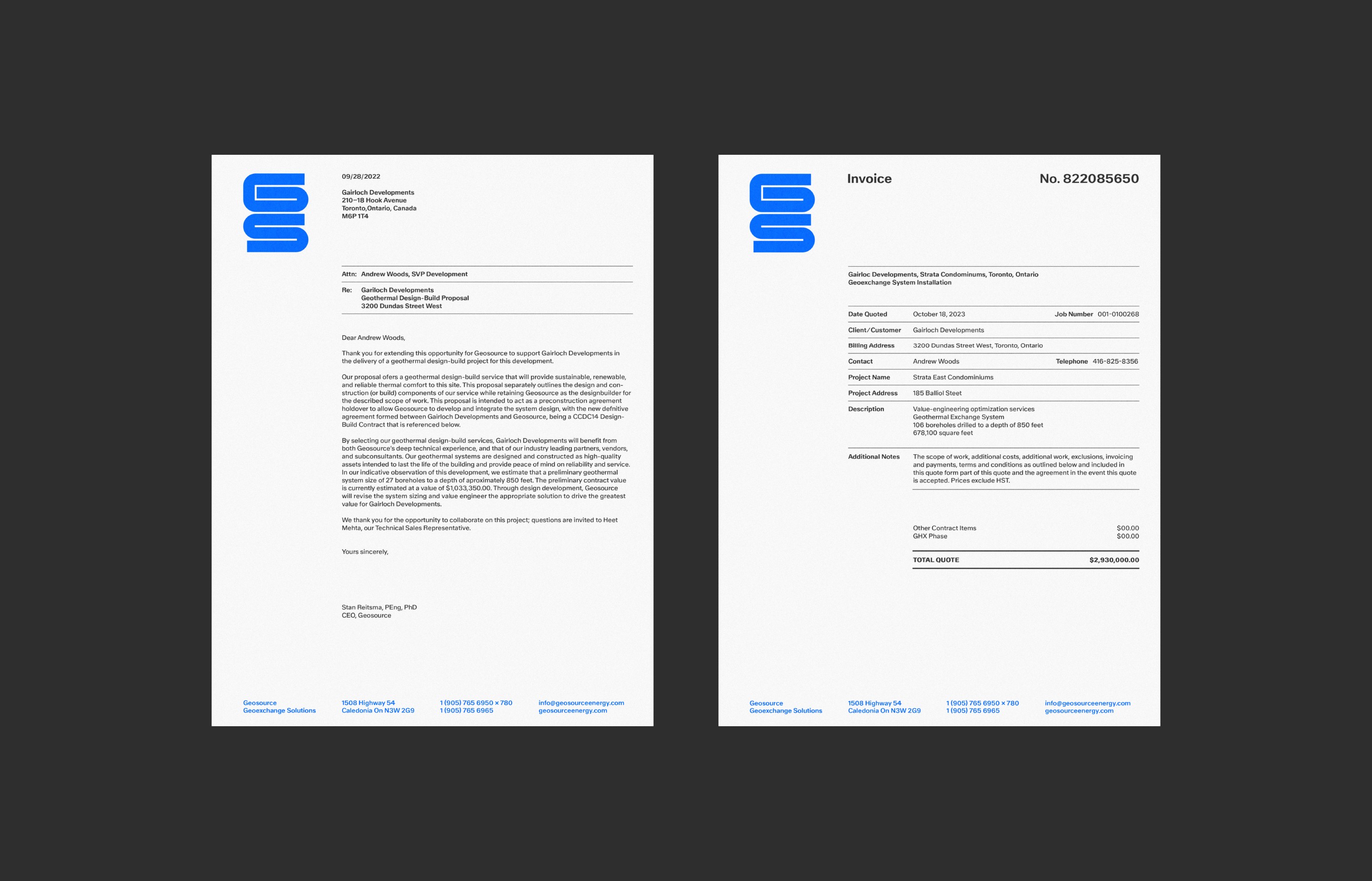 A rebrand for a geoexchange energy company on a mission to positively impact and change the way energy is delivered. The logo visually represents the geoexchange process, drawing inspiration from the drilling grid used to install GX systems and the pipe system that extends 500 feet underground. Our ambition was to create a brand strategy for Geosource that reflects their innovative technology, which uses the Earth's stable sub-surface temperature to sustainably heat and cool our spaces. As Geosource marked its twentieth anniversary, we aimed to create an identity that feels timeless and could have been crafted twenty years ago, or twenty years from now.